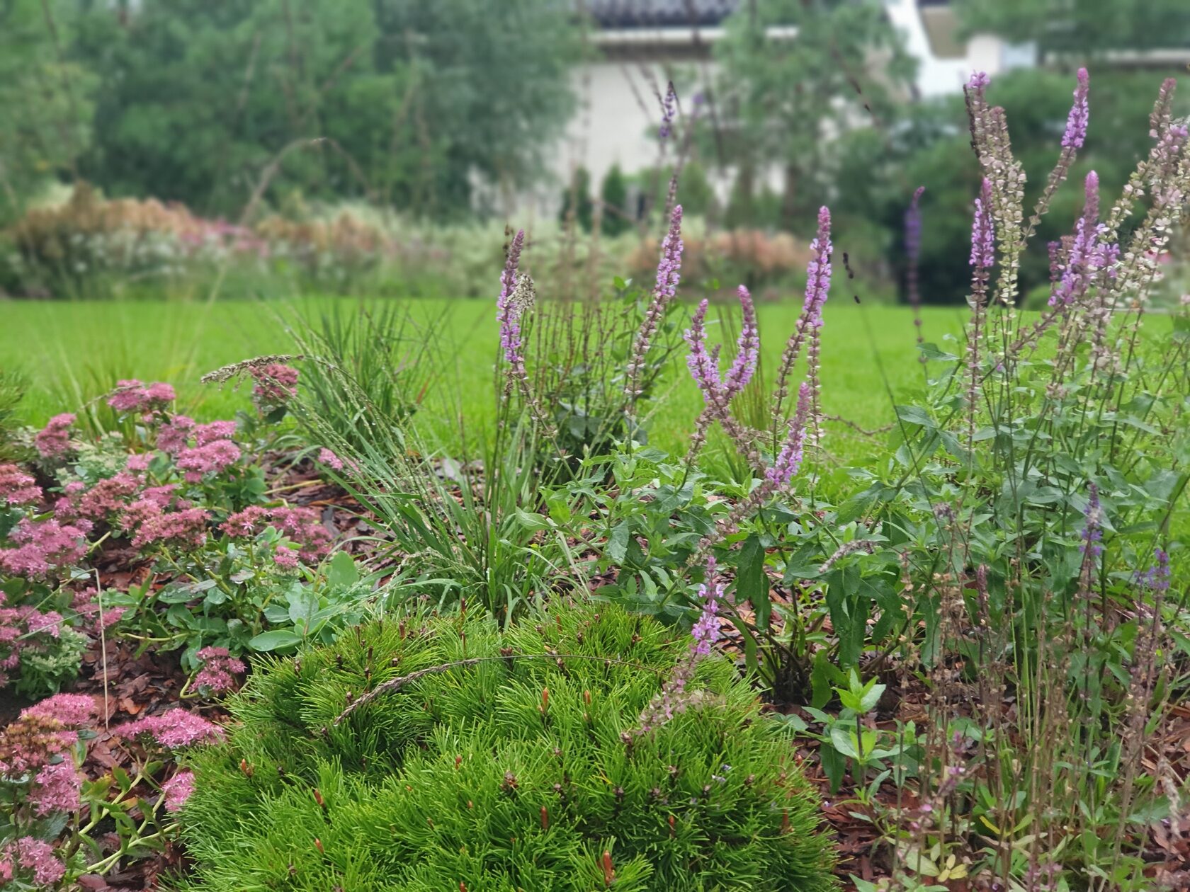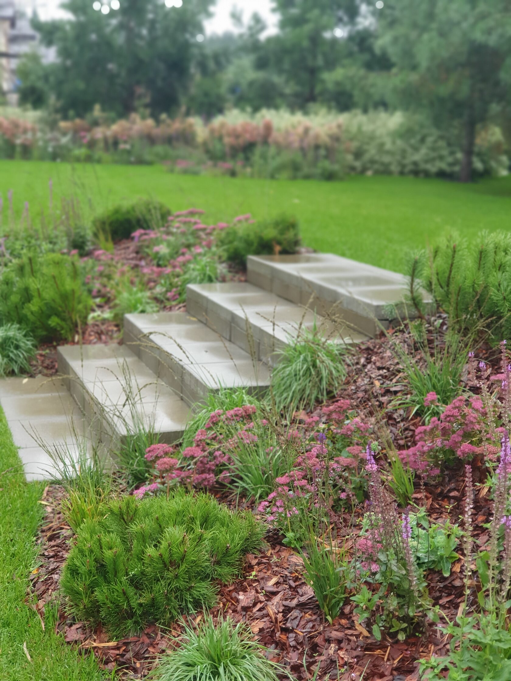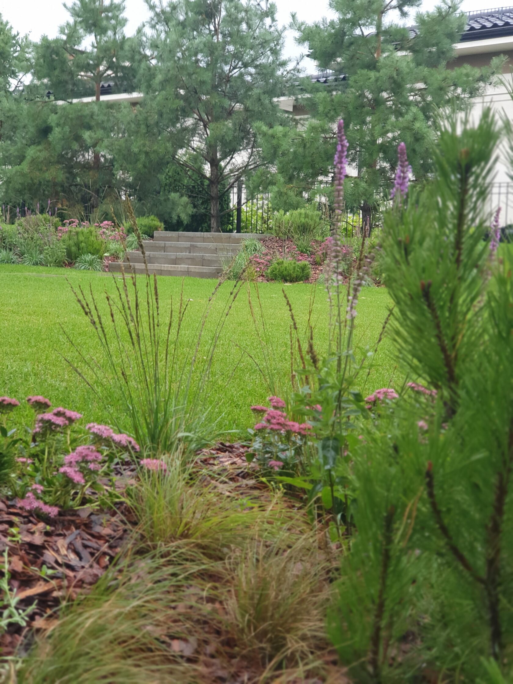 Сосны по границе участка были посажены застройщиком. Цветники в склонах террас оформлены в природном стиле.