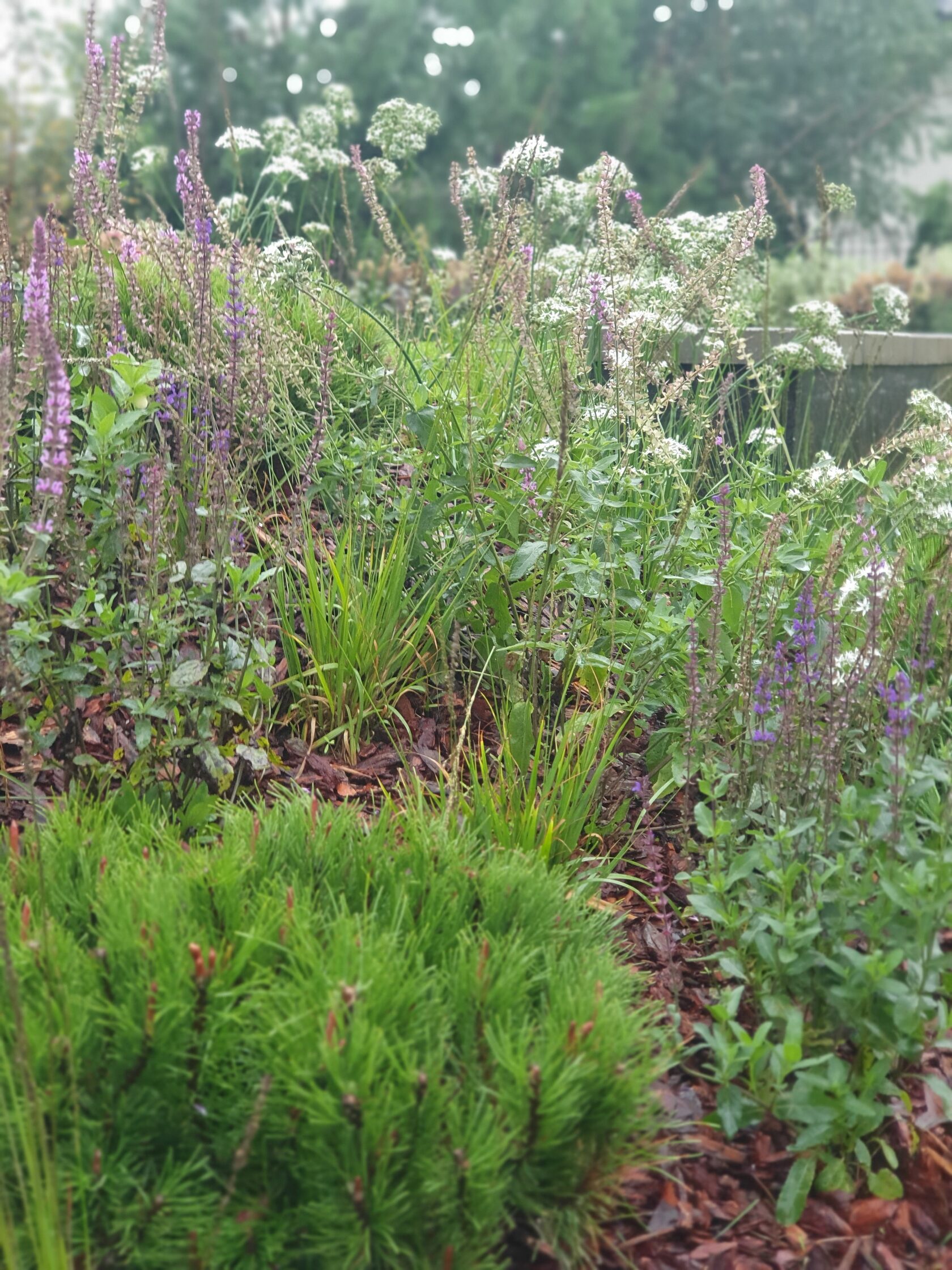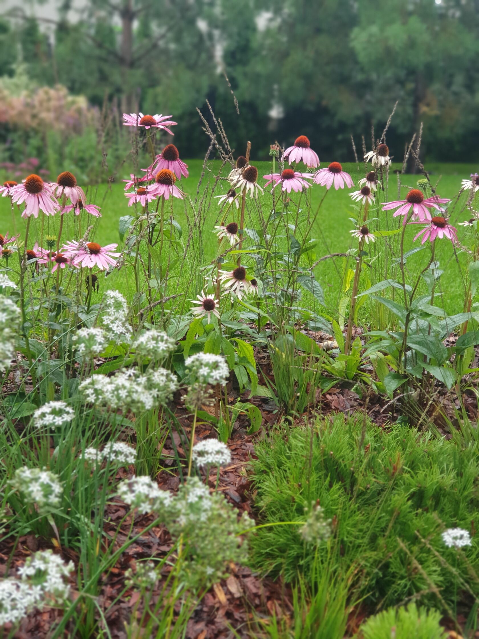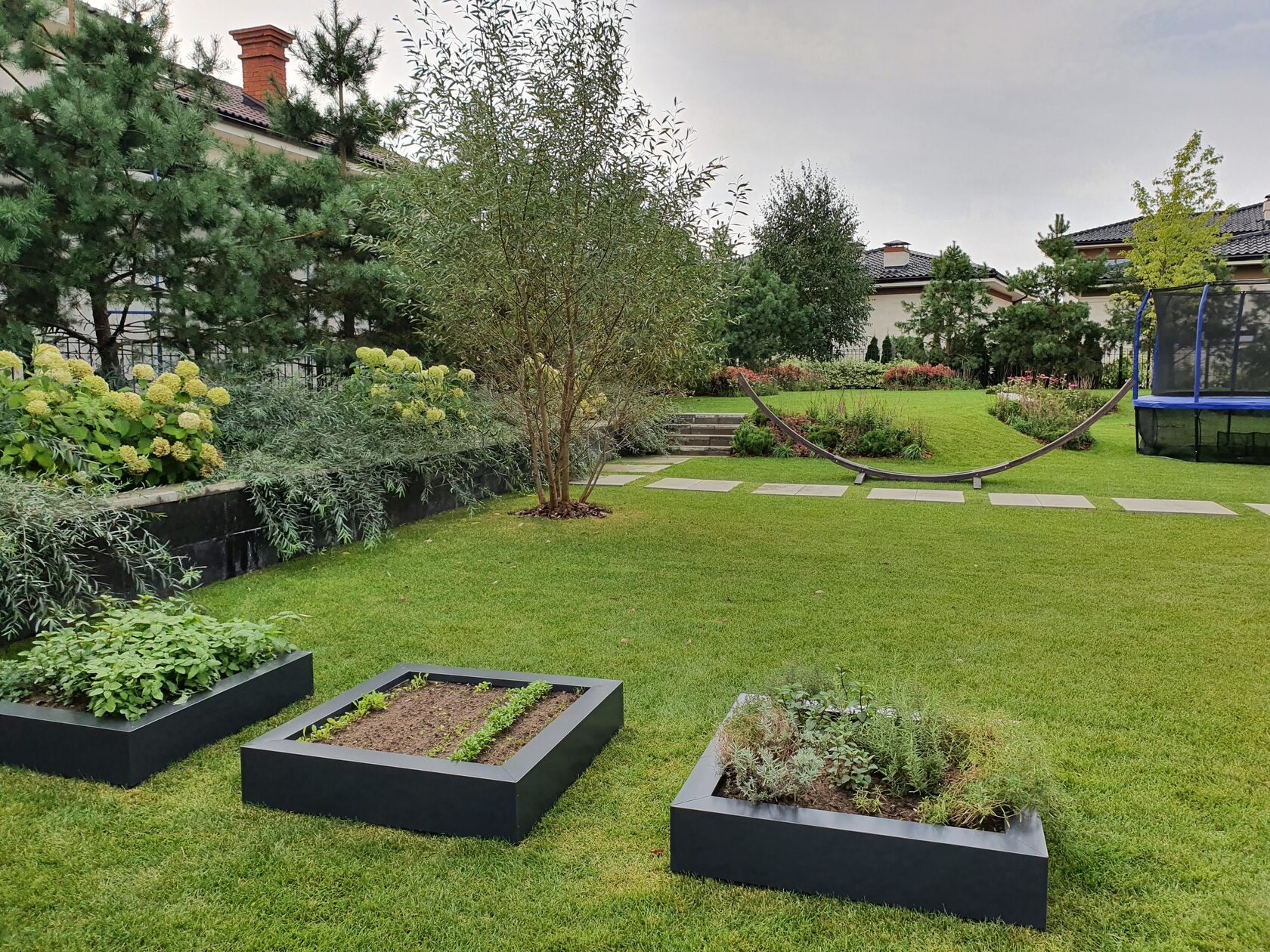 Сосны по границе участка были посажены застройщиком. Цветники в склонах террас оформлены в природном стиле.