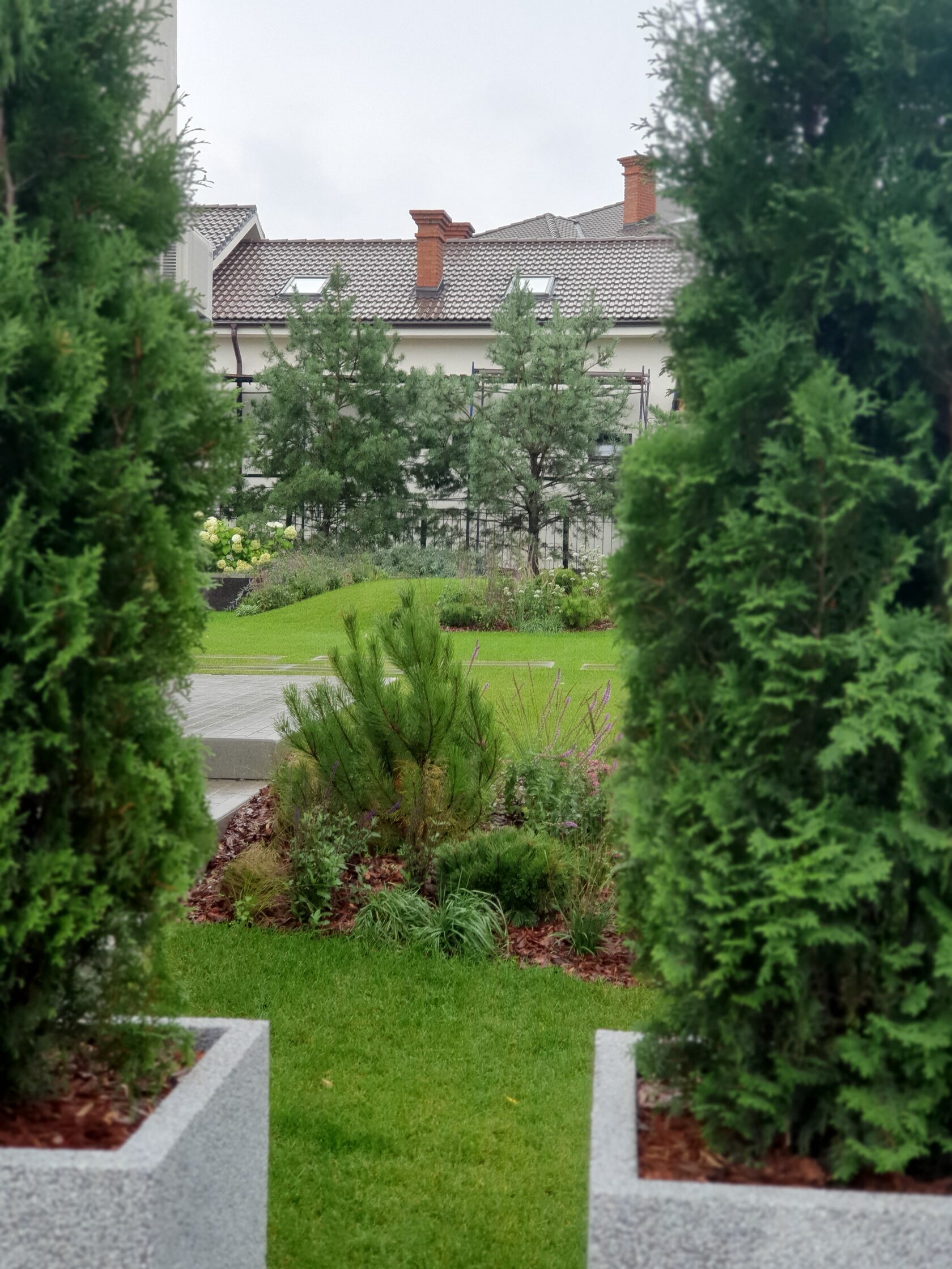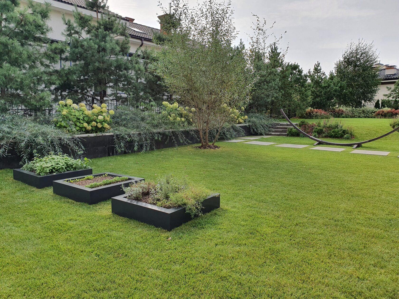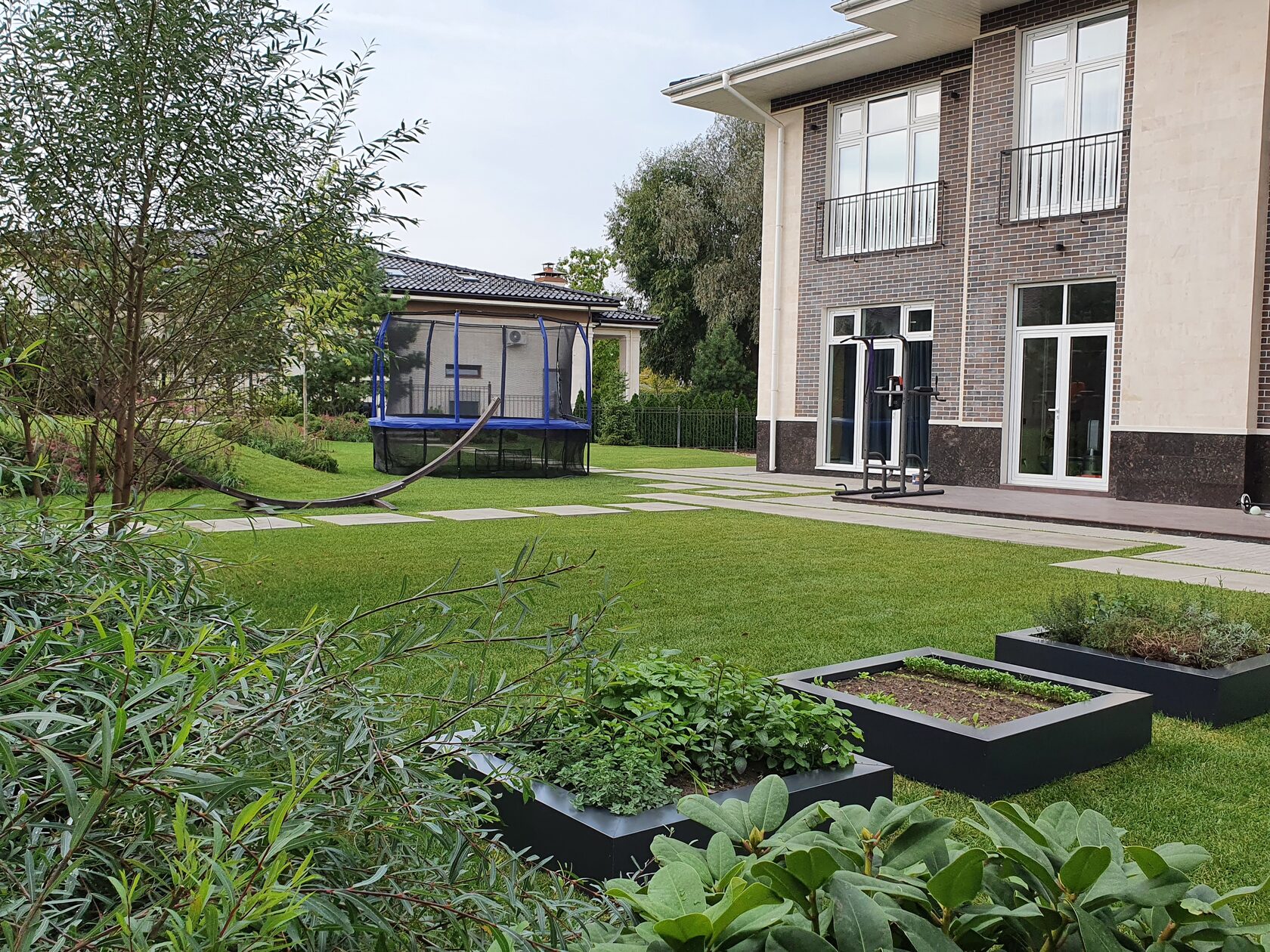 Расположенный на небольшом склоне внутренний дворик частного владения, был оформлен террасами с небольшим количеством подпорных стенок. Перепад рельефа был оформлен геопластическими решениями. Что позволило заказчикам обойтись небольшим бюджетом при производстве работ.