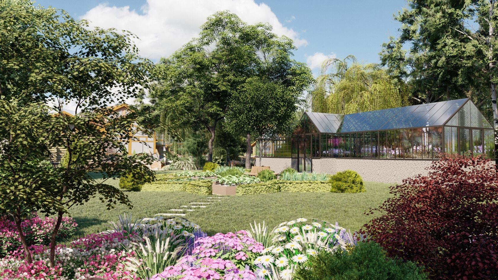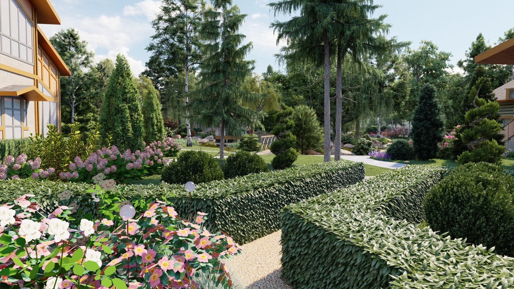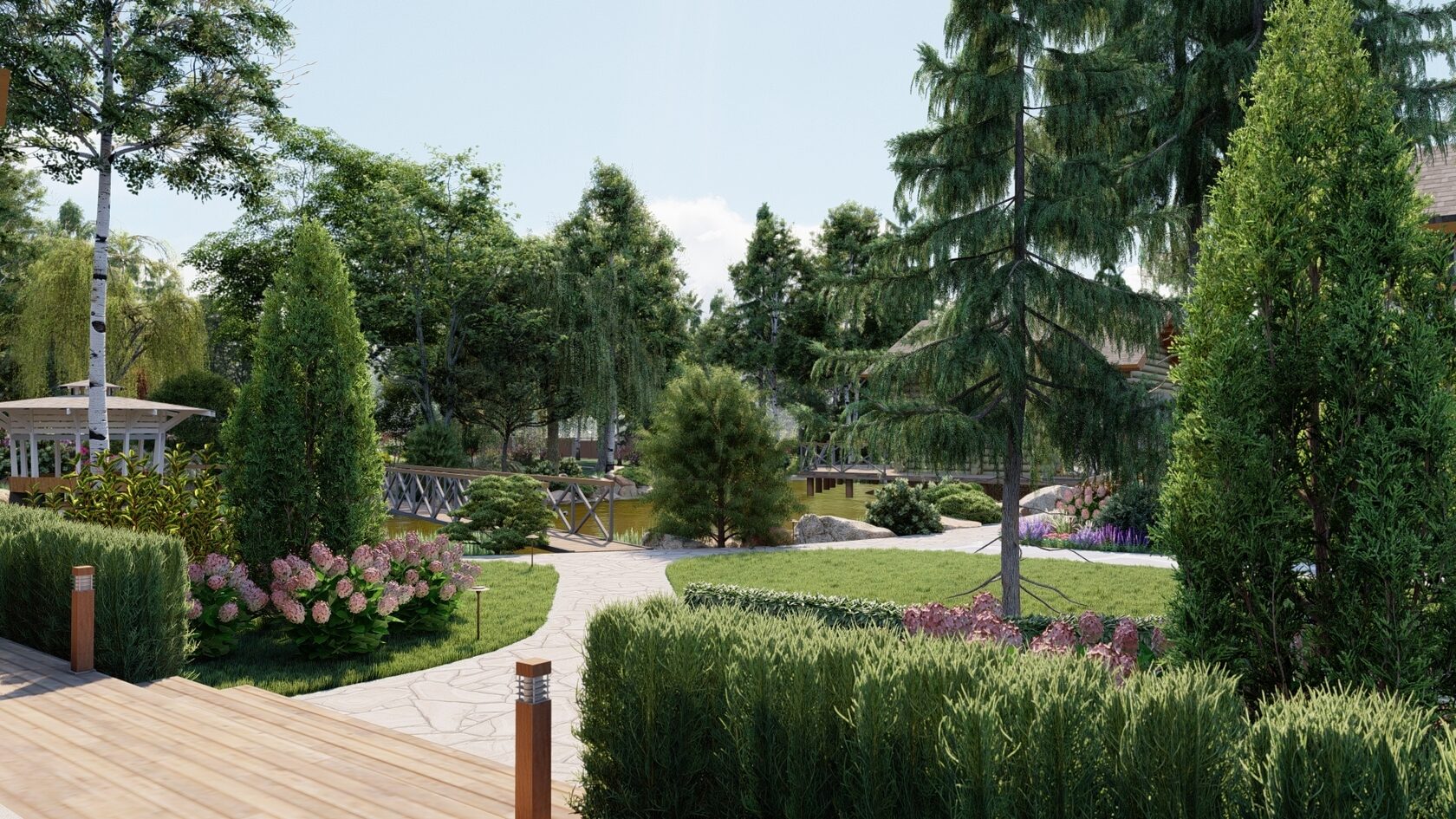 Достаточно большое количество крупных строений, окруженных вековыми дубами и елями предстояло соединить дорожно тропиночной сетью, которая также соединила остальные садовые объекты, не нарушая желаемых хозяевами маршрутов. Первая версия Генплана, была, конечно, менее красочная, чем итоговая. Но заказчица потребовала введения ярких акцентов в так любимый нами спокойный природный стиль