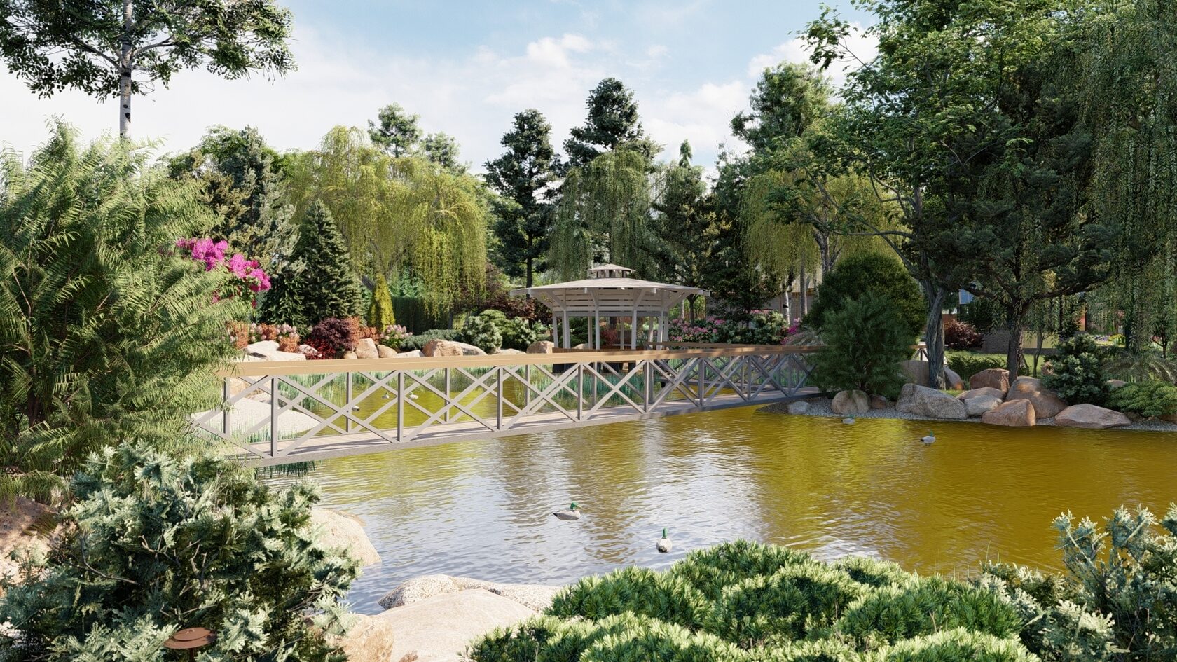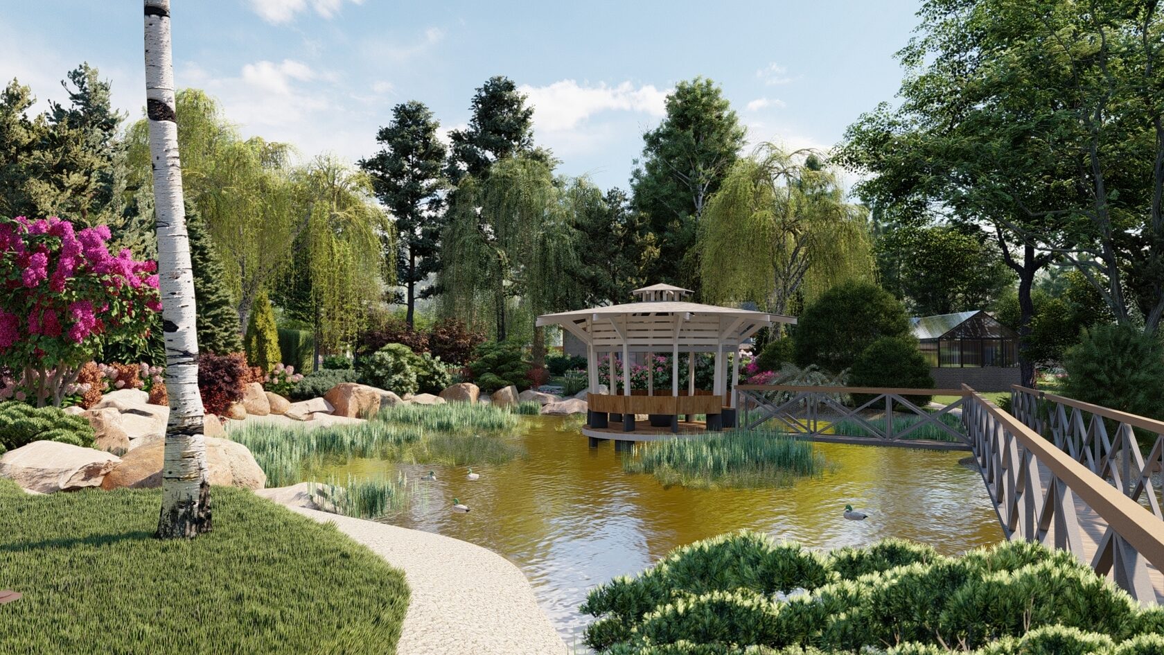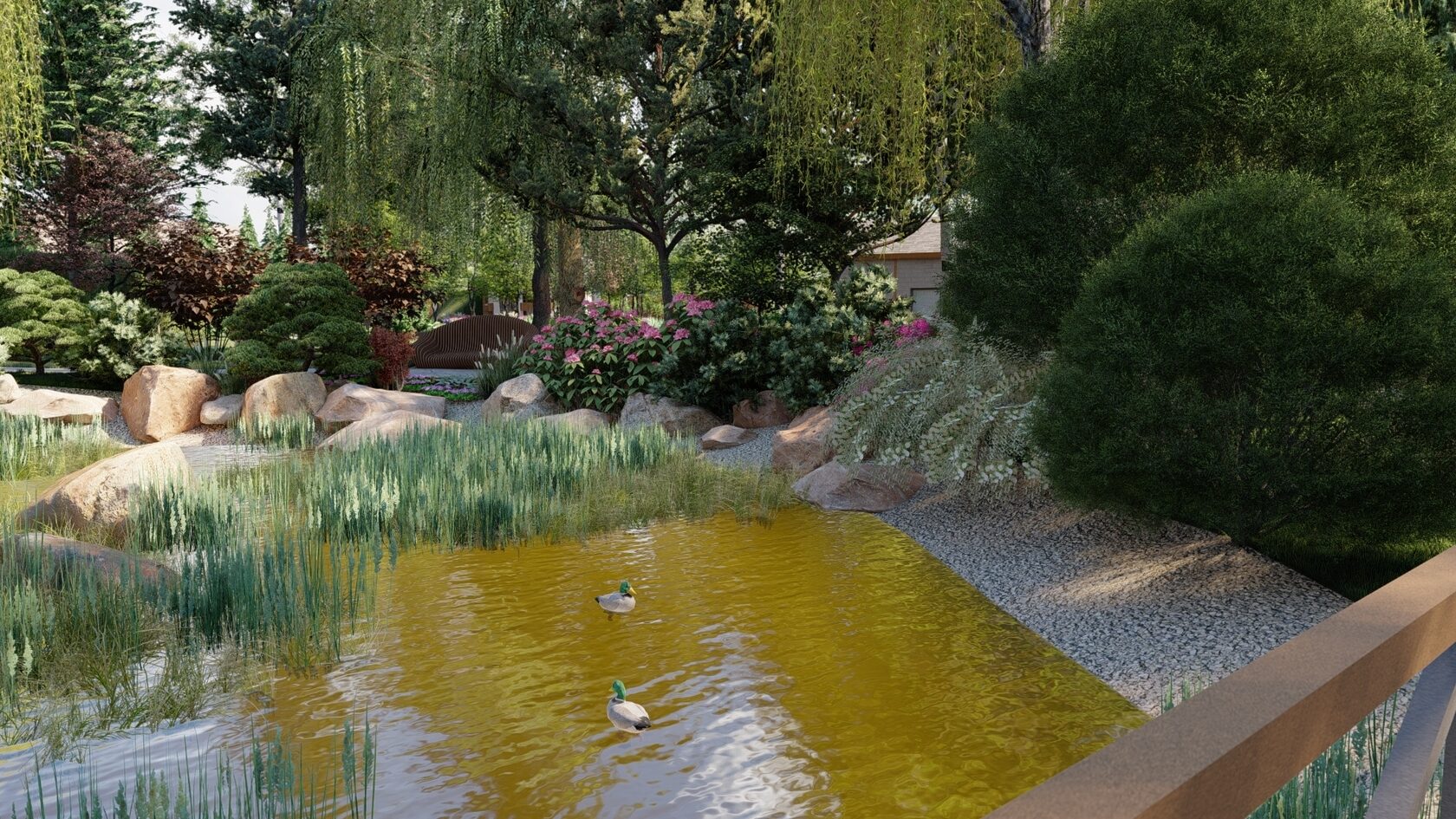 Основным акцентом, связующим пространство воедино, стал, конечно, водоем (площадью более 10 соток), декорированный валунами до 8 тонн. По задумке архитектора появился остров, площадью 70 м. кв с существующими деревьями, попасть на который можно было только чз мост. Также в пространстве водной глади расположилась беседка — чайный домик, место для уединения заказчиков.