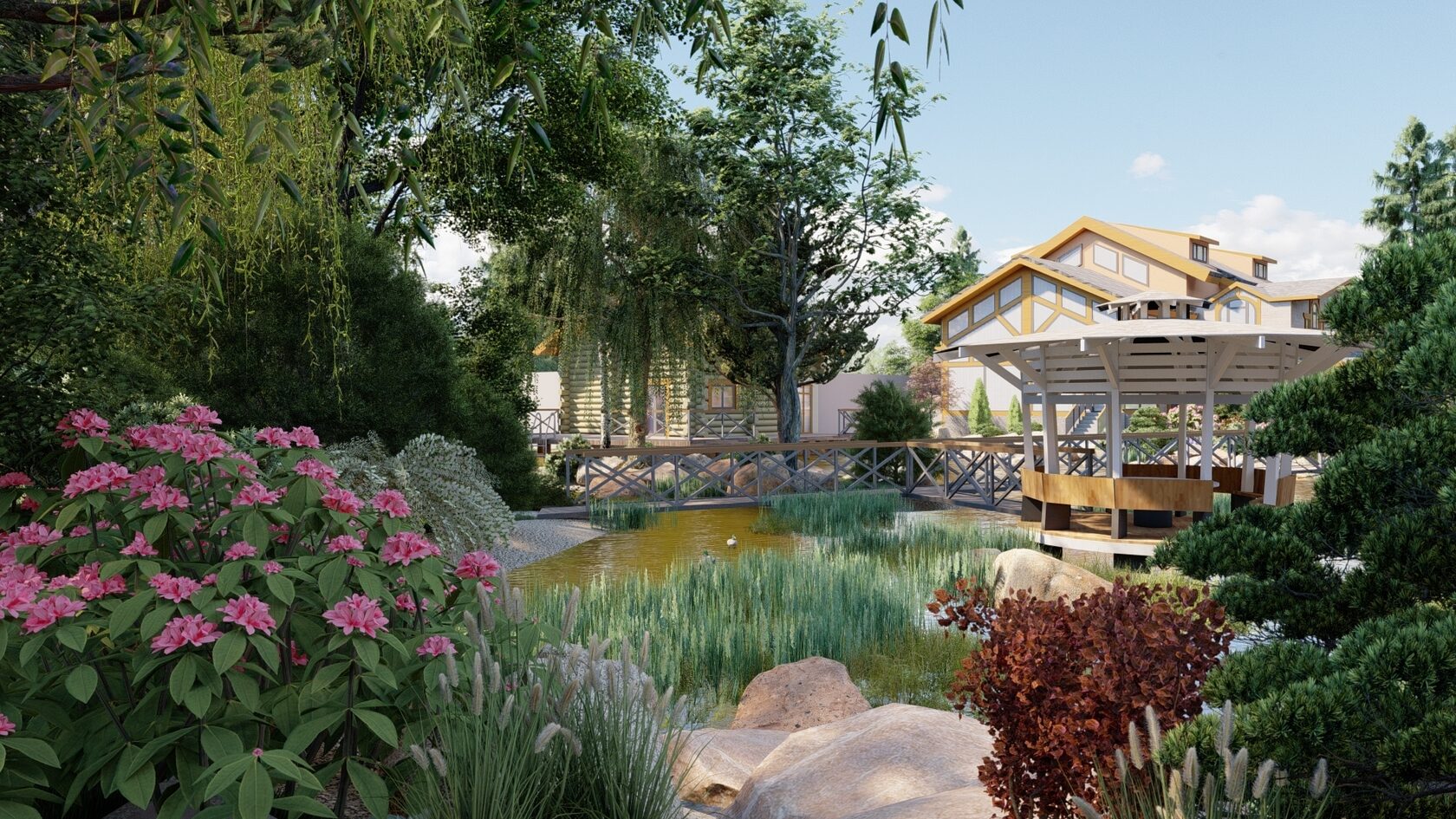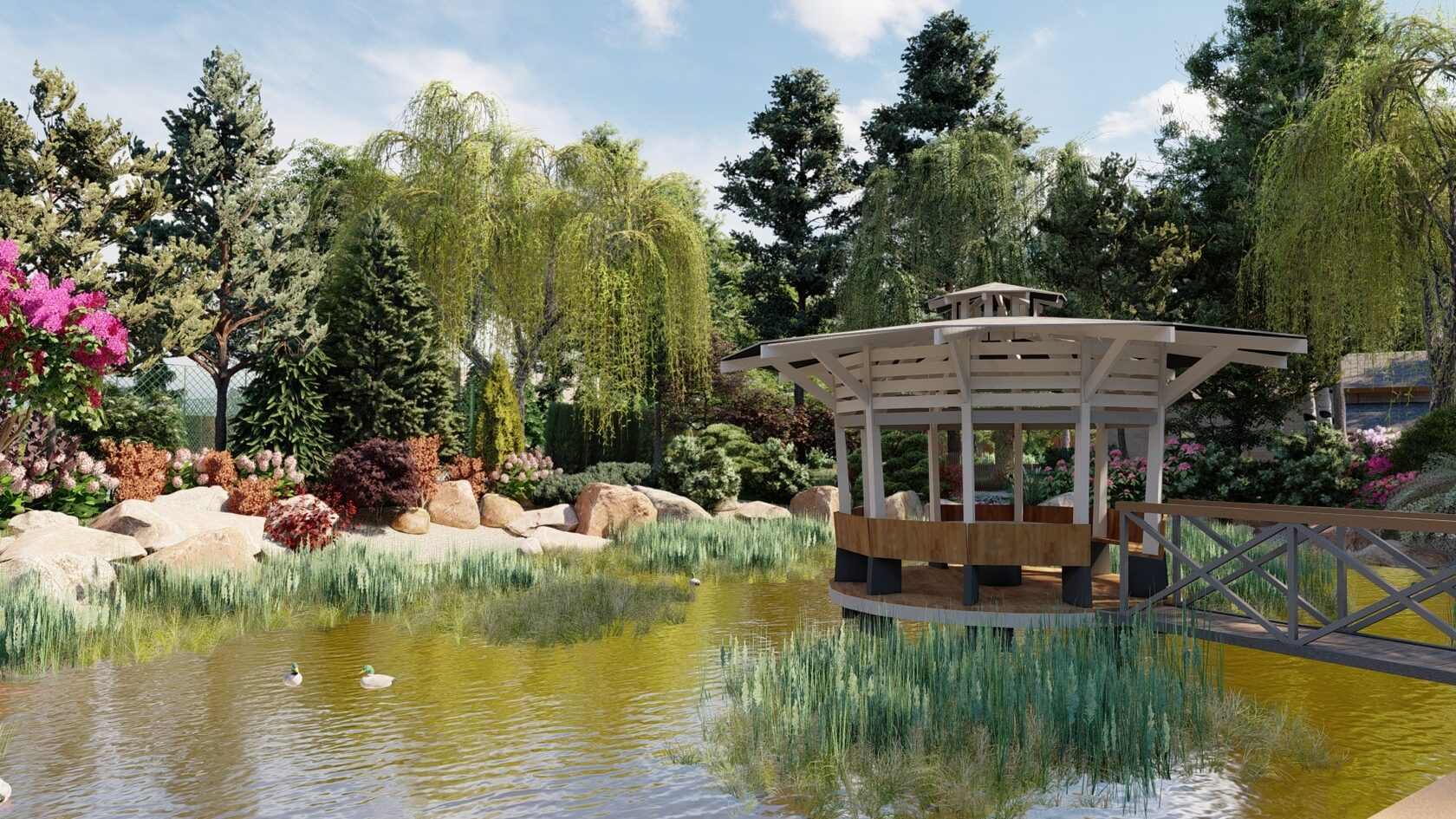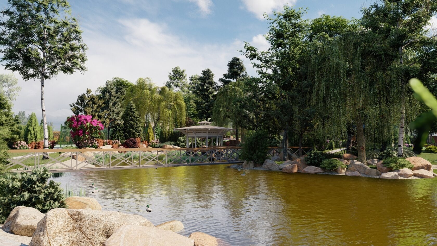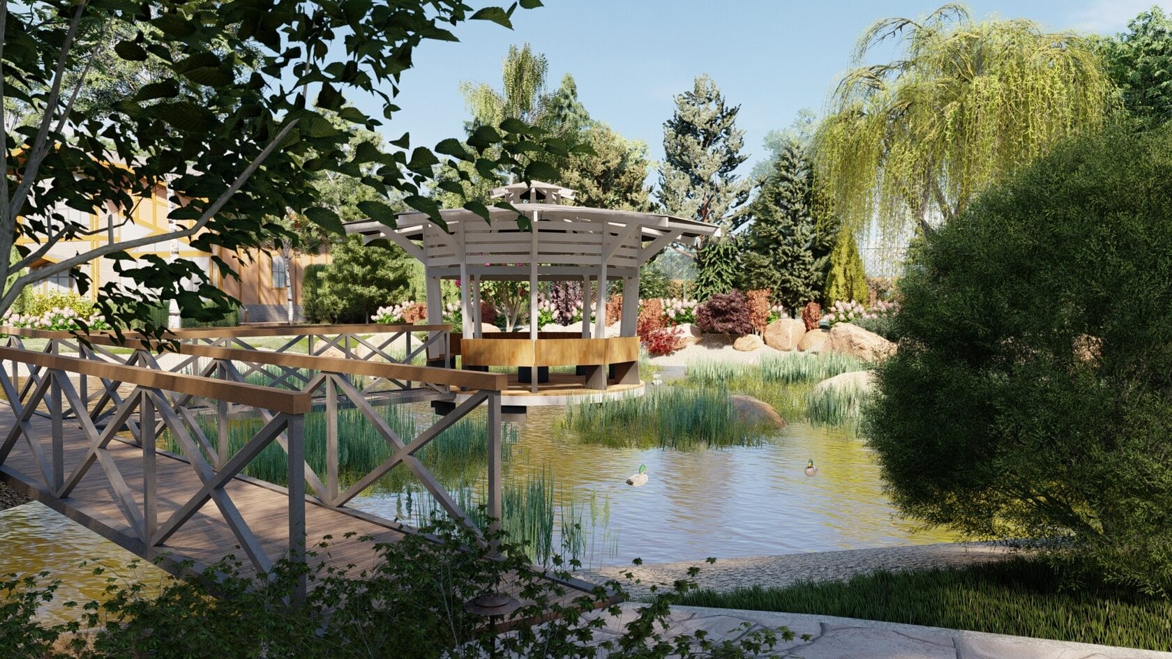 Основным акцентом, связующим пространство воедино, стал, конечно, водоем (площадью более 10 соток), декорированный валунами до 8 тонн. По задумке архитектора появился остров, площадью 70 м. кв с существующими деревьями, попасть на который можно было только чз мост. Также в пространстве водной глади расположилась беседка — чайный домик, место для уединения заказчиков.