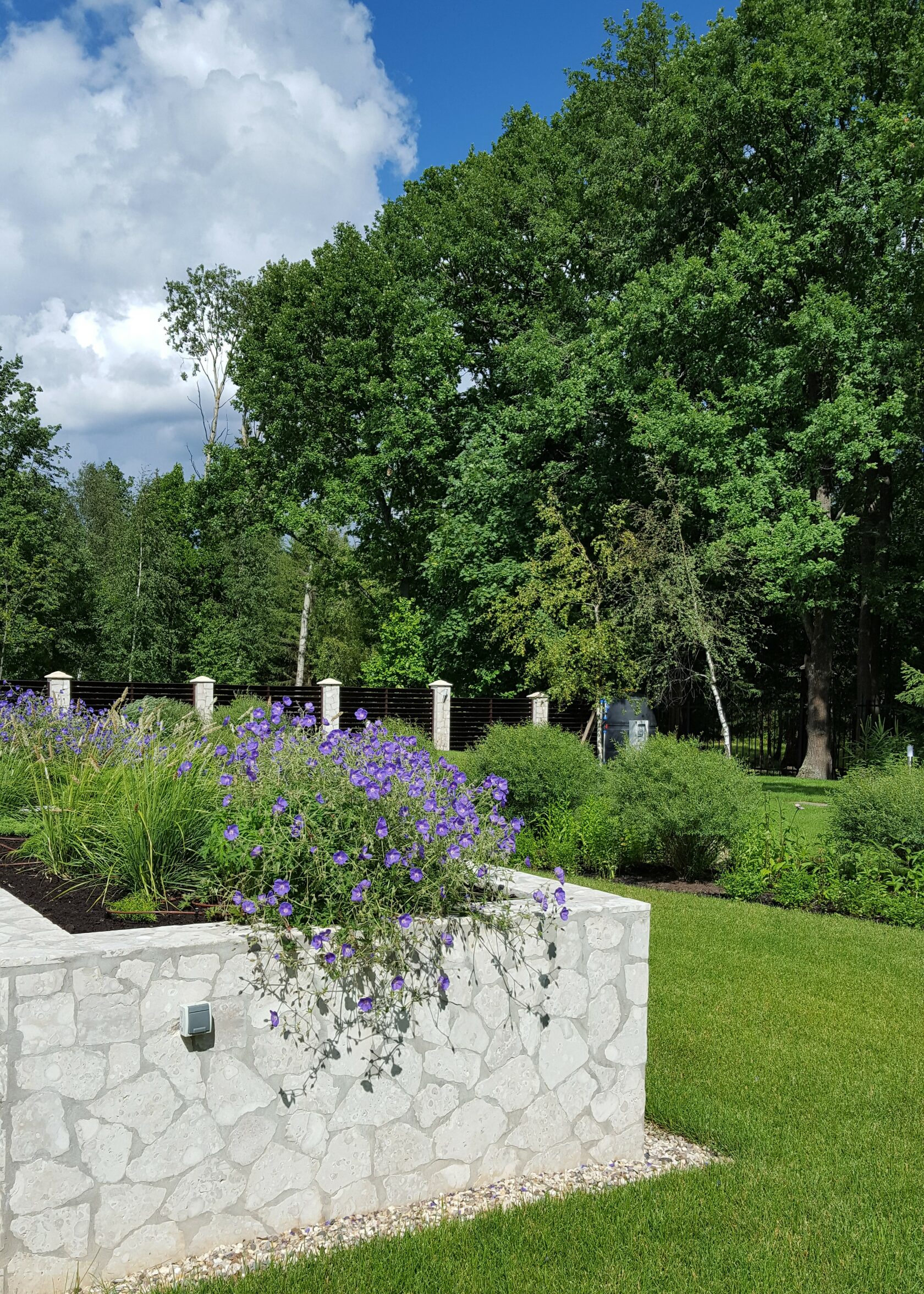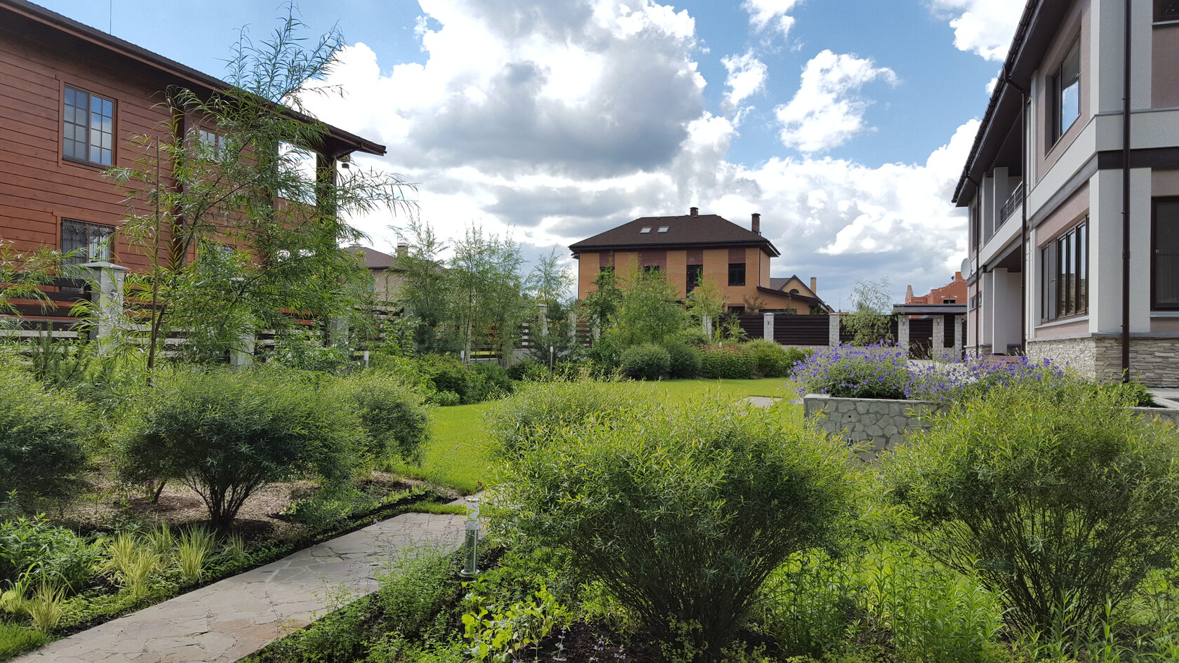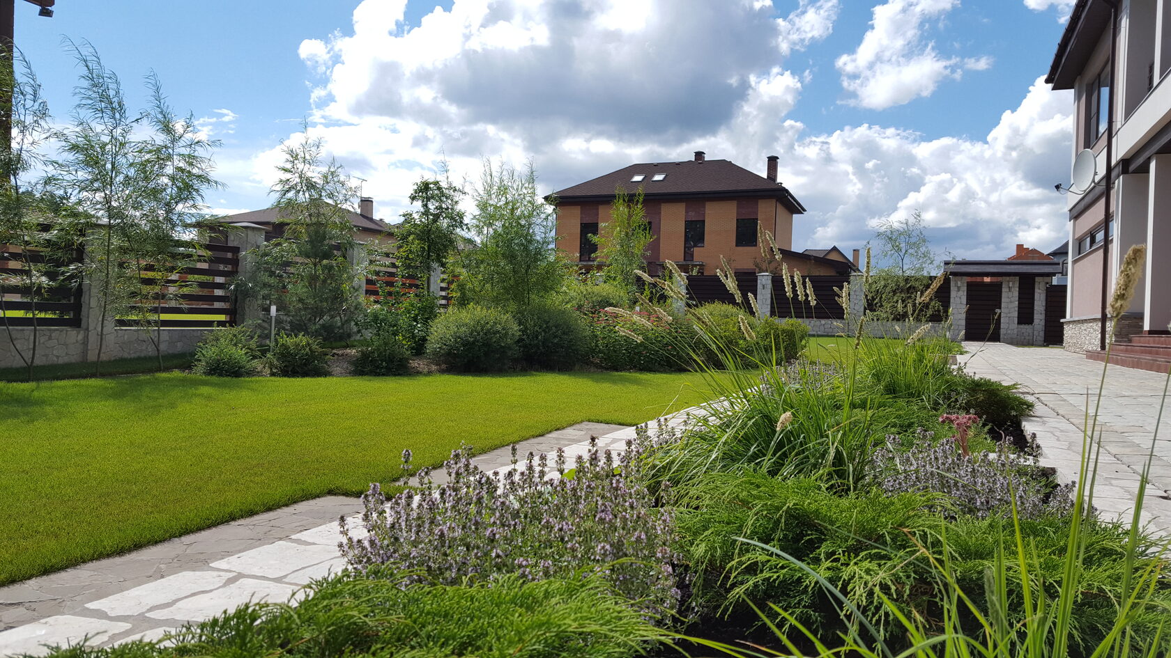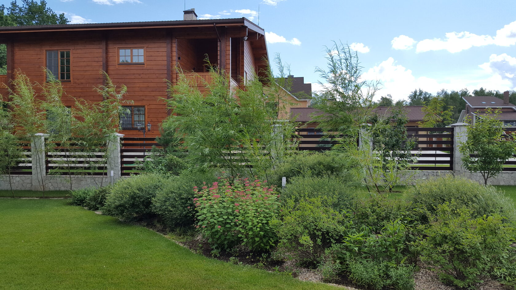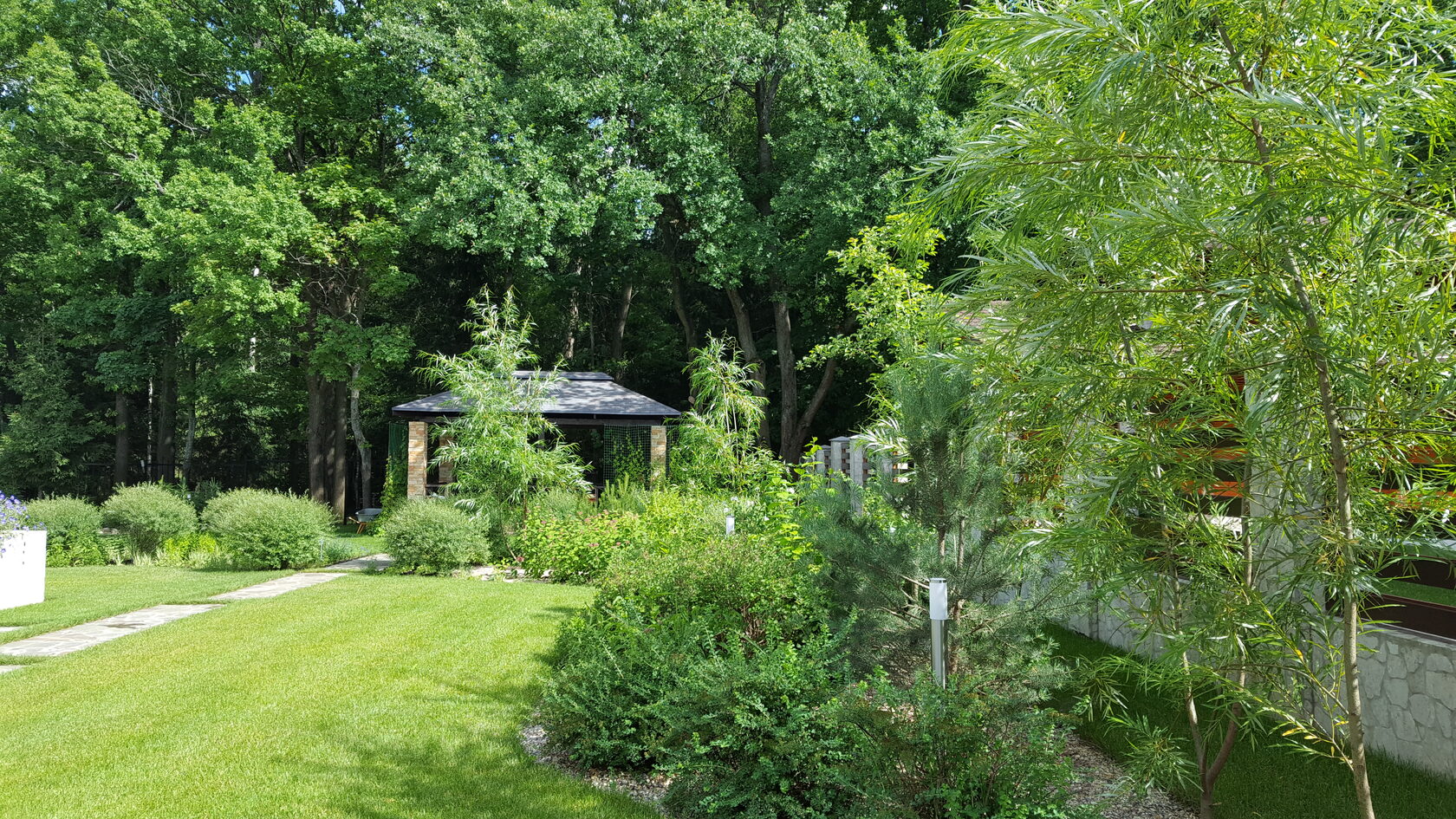 Все посадки выполнены в виде «волны», омывающей геометричные строгие формы строений, подпорок и дорожек. Для эффекта движения так называемой «волны» были посажены различные виды ив (Ива Шверина, Ива пурпурная, Ива Плакучий гном), а в нижний ярус добавлены злаки. Такое сочетание растений даже при небольшом дуновении ветра создает эффект текучести и движения.