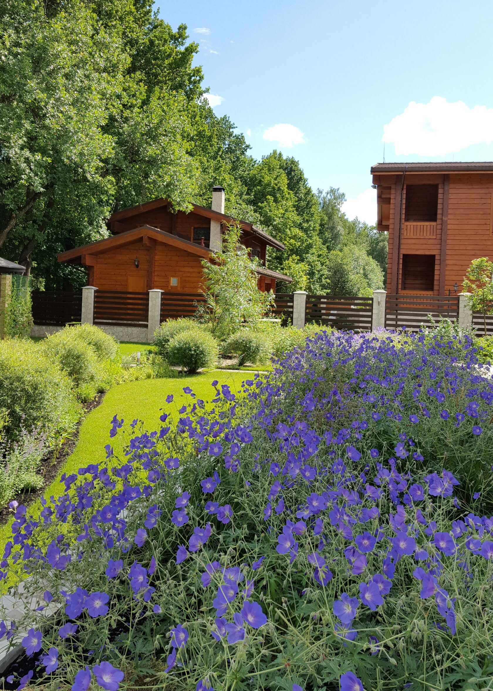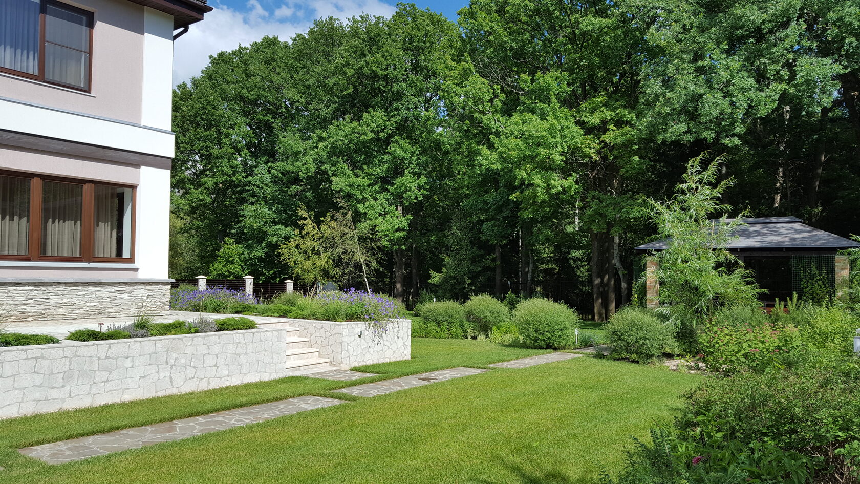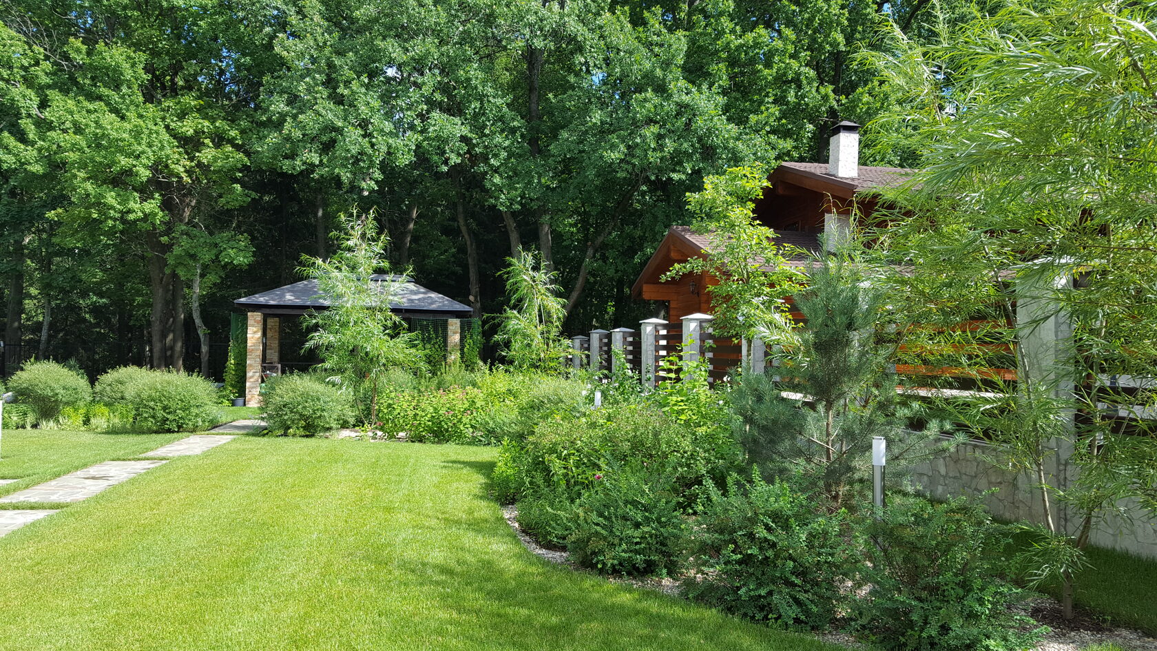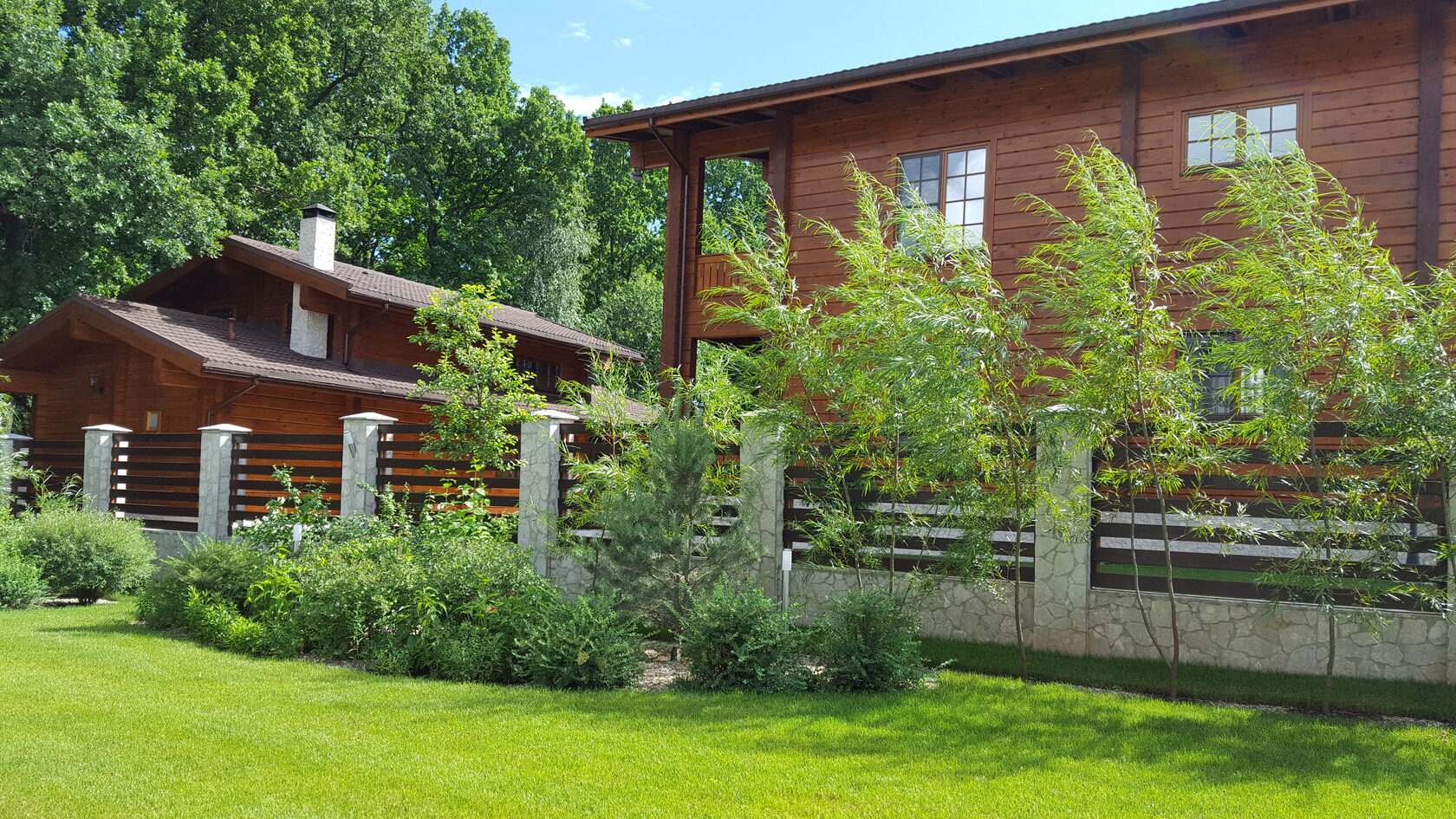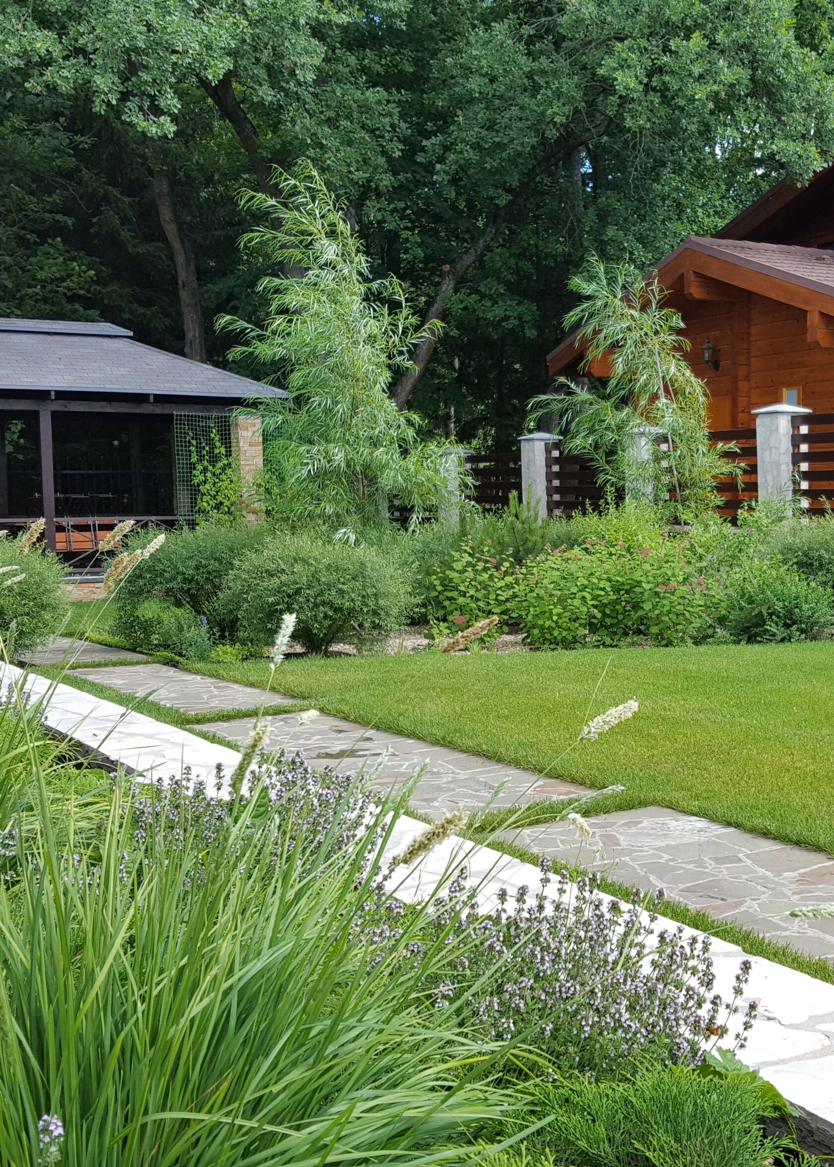 Все посадки выполнены в виде «волны», омывающей геометричные строгие формы строений, подпорок и дорожек. Для эффекта движения так называемой «волны» были посажены различные виды ив (Ива Шверина, Ива пурпурная, Ива Плакучий гном), а в нижний ярус добавлены злаки. Такое сочетание растений даже при небольшом дуновении ветра создает эффект текучести и движения.